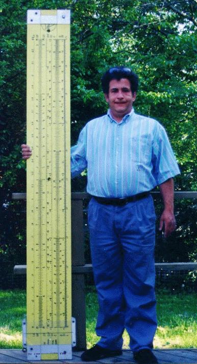 7 Foot Teaching Rule, One of Pickett's popular school demonstration rules, held up by (and dwarfing) 5 foot 7 inch slide rule collector Craig Kielhofer. Craig scooped this beauty through an internet offer for sale, and drove to get it rather than trust to the uncertain mercies of motor freight. Pickett used to give these rules to schools that bought 25 rules or more for classes, and thus managed to get their rules prominently displayed in the field of view of many high school and college students all over America. Demo rules existed in many models, both simplex and duplex, and this example is essentially a giant N1010ES. These painted plywood rules also existed in 4 foot formats (much easier to ship, by the way). Here's a look at one end scale detail, and here's the other.