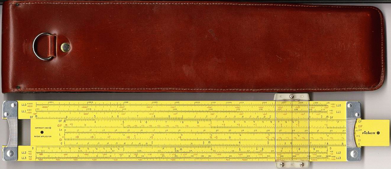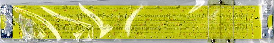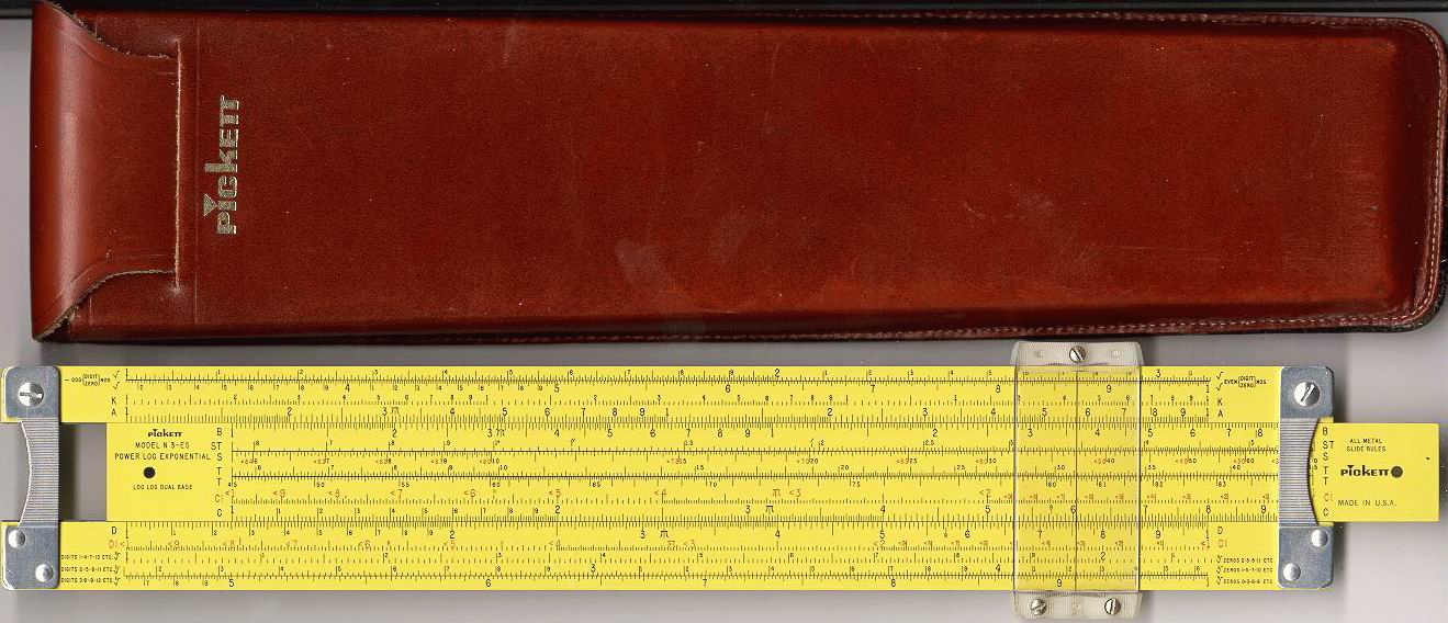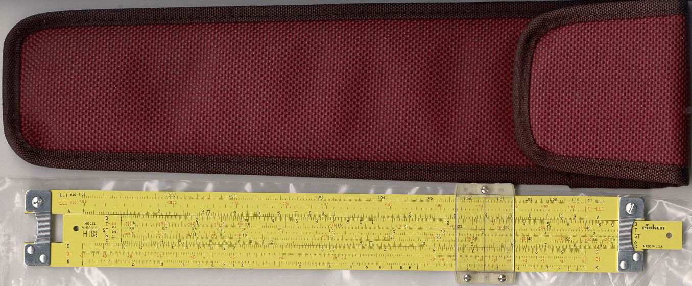 PRIME NIB Picketts, found a few more! 6"/5" Pocket Slide Rule Eye Saver (ES) Yellow body style, (T) is Traditional White. Don't miss your chance to get one of these beautiful and compact pocket rules, in a great gold logo-embossed, black leather case. Ideal as gifts, they are a very popular rule. See also the N700T below for a similar set! (12 Scales) Front - K, A, [ B, CI, C, ] D, L Back - [ S, ST, T, C, ] D |