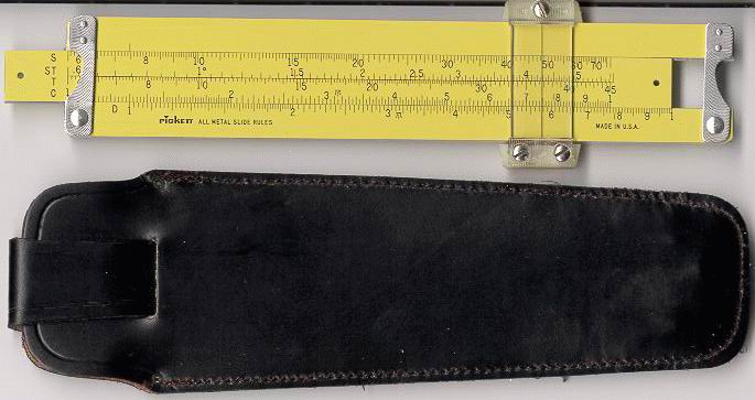 12" / 10" Vector Type Log Log Dual Base Speed Slide Rule VERY EARLY MODEL (with square corners and flat cursor), USED but very good condition. Eye-saver Yellow (ES) or White Traditonal (T) coated aluminum construction, all black/white scales, dual log scale design in one of Pickett's most powerful rules. This is a very sophisticated 34 scale rule, made in the trademark aluminum body format by Pickett, an extremely powerful but somewhat crowded rule. Has hyperbolic scales, expanded trig, square and cube root scales, DI and two types of folded scales. This set has a new SRC case supplied, similar to the set pictured. Sometimes we have an original Pickett leather case that is in good enough condition to supply, and can offer it at the same price. UNLIKE the other rules in this section, THIS RULE IS USED, but is in very good condition, it's here because it's a lot easier to find this way, and we have no new N4's to offer right now. Note that the full Pickett teacher's manual is now on line HERE for you FREE!