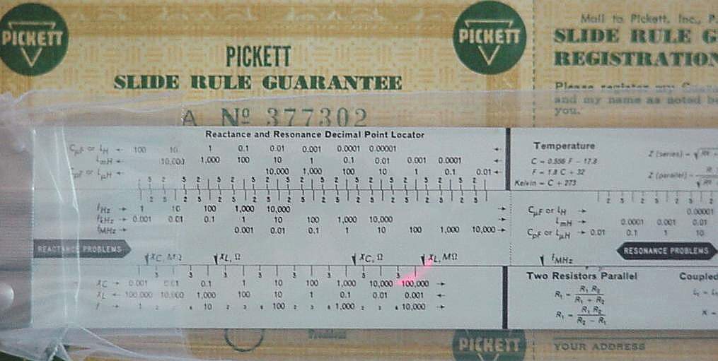 12" / 10" Electronic Duplex Slide Rule VERY LATE MODEL, NEW in factory box, boxed set with black leather case, 2 manuals, and belt loop. Traditional (T) white coated aluminum construction, black and red scales, optimized for electronics problems, with dual marking on the front, and Chan Street special multi-decade electronics scales on the rear (Like the N16!). This is an extremely useful rule, made in the trademark aluminum body format by Pickett. We have just one left, when it's are gone, that's it. (16 Multi-function Scales) Front - L, Ln, Cr/AI, [ Lr/B, ST, T, C/L/I/C, ] F/X/E/R/W/D, Xc/DI, K Back - Reactance/Resonance Decimal Point locator scales formulas and factors CLICK for BIGGER PIC OF 535T Back scales! ![]() CLICK for BIGGER PIC OF 535T Back scales! |
