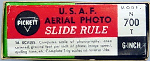 6"/5" Pocket USAF Aerial Photo Slide Rule BRAND NEW, BOXED SET with the primo Pickett oxblood leather clip case with a data factor rear insert, sleeve box and manual. Very powerful compact rule with 16 scales! Yes, we KNOW you don't have a lot of aerial pictures to scale, but the flip side is a great Pocket Trig rule, similar to the N200! Traditional White (T), black scales, including folded and inverted scales, plus trig scales, all aluminum construction. Don't miss your chance to get one of these unusual pocket rules, they are an excellent design, and very useful in the pocket sized format with the built in data table. (16 Scales!) Front - L, A, DF, [ CF, CIF, T, S, C, ] D, DI, K Back - Ground Size, Ground Speed, [ Image Size cm, inch, Focal length, ] Altitude