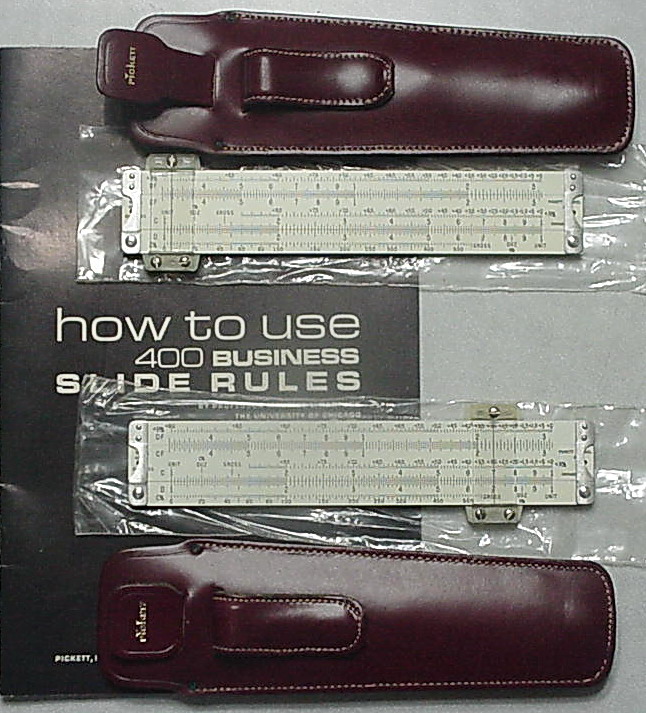 ![]() CLICK for bigger PIC! Great BOXED TWIN Log Log Sets! 12" / 10" Hi Log Log Duplex Slide Rule VERY LATE MODEL, BRAND NEW, in the Pickett factory box. Eye-saver yellow (ES) coated aluminum construction, black and red scales. This is a very sophisticated rule, made in the trademark aluminum body format by Pickett. Boxes have both rules (N500ES/N300ES) in the Mustang tan leather suede cases. Complete with manual, leather case and guarantee certificate. Some storage marks on the boxes, we will ship the best ones first, one set has the special student price ($18.95) marked inside, one is blank as shown. (N500ES-22 Scales) Front - LL2+0.1, LL2-0.1, DF [ CF, CIF, L, CI, C ] D, LL3+1.0, LL3-1.0 Back - LL1+0.01, LL1-0.01, A, [ B, T, ST, S, C ] D, DI, K (N300ES-16 Scales) Front - LL1, A, [ B, T, S, C, ] D, LL2 Back - LL3, DF, [ CF, CIF, CI, C, ] D, L |