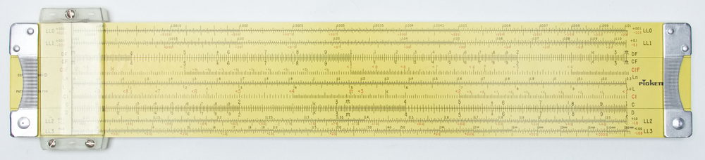 We had hundreds, sadly all gone. 6"/5" Pocket Log Log Speed Slide Rule BRAND NEW, BOXED SET with the primo Pickett oxblood leather clip pocket case (gold Pickett logo), display box and manual and Pocket Duplex Log Log Speed Rule, Very powerful compact rule with an amazing 22 scales! Eye Saver Yellow (ES), black and red scales, aluminum construction. Don't miss your chance to get one of these very powerful pocket rules, they are an excellent design, and incredibly useful in the pocket sized, clip case format. (22 Scales!) Front - LL1+, LL1-, A, [ B, ST, T, S, C, ] D, DI, K Back - LL2+, LL2-, DF, [ CF, Ln, L, CI, C, ] D, LL3+, LL3- |