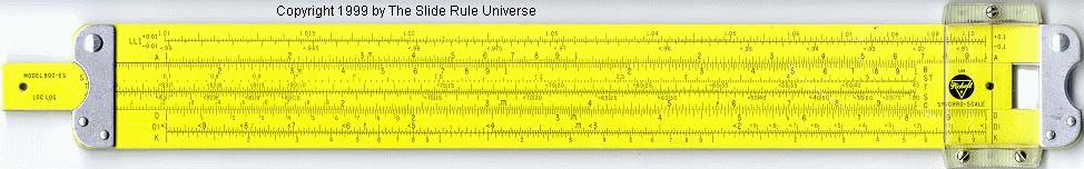 12" / 10" Power Log Exponential Log Log Duplex Slide Rule LATE MODEL Set, complete with NEW clip case and manuals (NOT THE EXACT SET SOWN). Yellow 'eye-saver' (ES) coated aluminum construction, black and red scales, dual log scale design in one of Pickett's most powerful rules. This is a very sophisticated 32 scale rule, made in the trademark aluminum body format by Pickett, one of my Favorite Pickett rules, with a less cluttered layout than the N4, but still extremely powerful. This set has the oxblood finish leather case with pocket clip. This set was assembled from individual parts. Note that the full Pickett teacher's manual is now on line in Adobe Acrobat PDF format HERE for you FREE! (32 Scales !) Front - 2 sq. root scales, K, A, [ B, ST, S, T1, T2, CI, C, ] D, DI, 3 cube root scales Back - LL0+, LL0-, LL1+, LL1-, DF [ CF, CIF, Ln, L, CI, C, ] D, LL2+, LL2-, LL3+, LL3- |