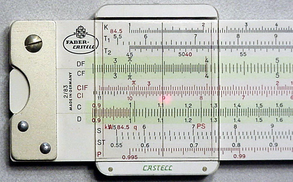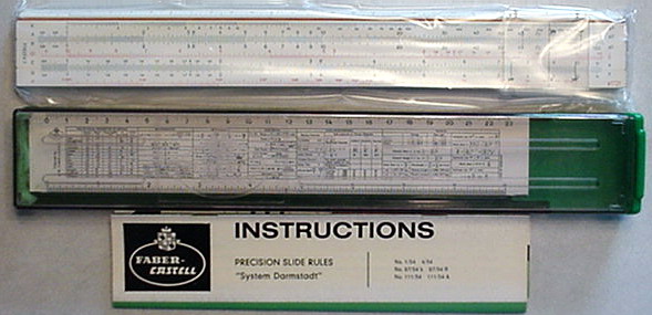 FC Classic Sets, MORE Just Arrived! 12"/10" Full Size System Darmstadt Mannheim Slide Rule. Faber's advanced Mannheim rule, widely used in Europe, and a real classic. Includes a reprint of the hard to find factory English manual and clear/green compact display case! This rule has a visible wood core, with white celluloid faces, black and red filled and engraved scales, plus 2 side cursors and scale sets. This is a very unusual design, with a complex 3-sided, 7 line cursor, and is the final (late) version of this rule. Has the Rietz over-range scale extensions, plus the Pythagorean scale (P), side log scale on top, and side sine and tangent scales at the bottom. Slide reverse has 3 log log scales (ex). Scales are self documenting on the right side. Celluloid 3 line cursor. This rule has has a blank back, with 2 rear cursor windows for the 3 log log scales on the slide reverse, and bevelled side cm ruler. Enjoyable to use, and lovely to look at, every surface has been used to do something useful. Older models had formulas and factors on the back, this late rule has a complete accessory ruler included (cm and inch) with the factor data on it. Pic is one of the actual rules offered. This is a real classic rule treasure, don't miss your chance to get a new MINT set, no more new stock once these are gone. (13 Scales and cm ruler) (RH) Front - K, A, [ B, CI, C, ] D, P Back - 3 (ex) scales. Top Side - cm ruler, L Bottom Side - S, T |