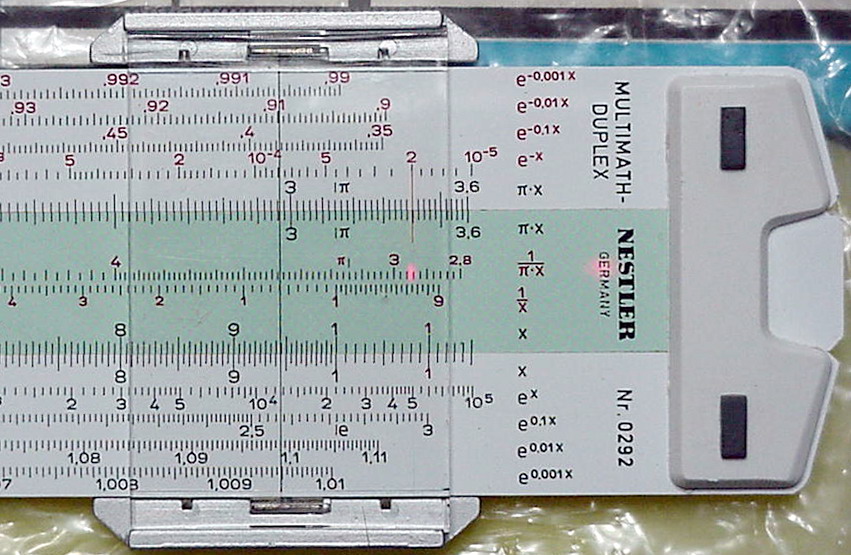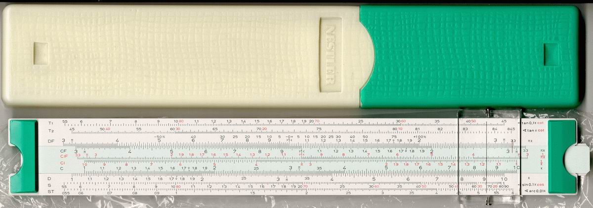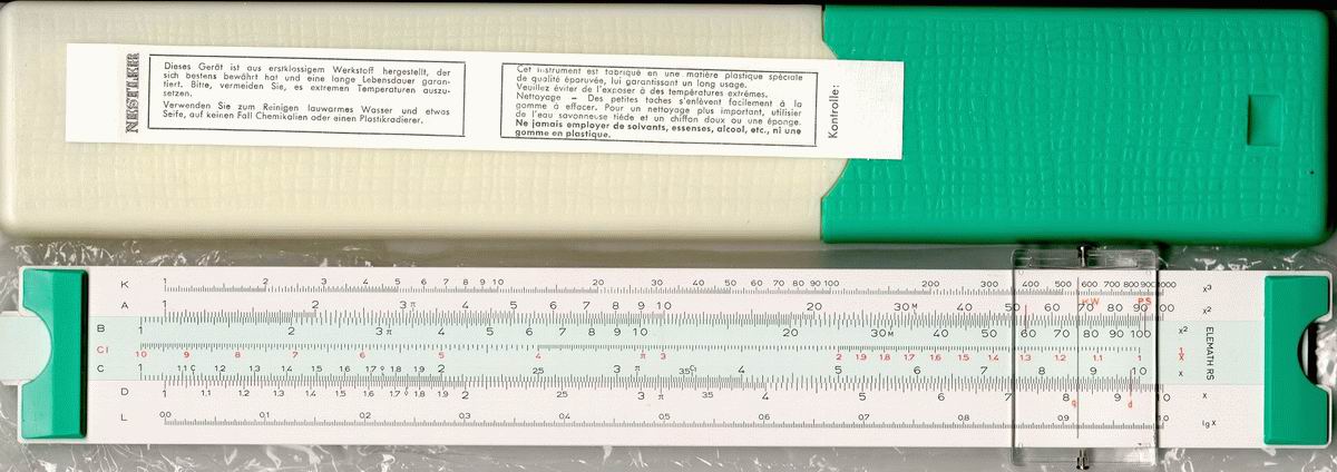 Last 4 Sets! 10" Elemath RS Duplex Slide Rule Nestler's late production style duplex rule. BRAND NEW rule, with 2 part plastic case. Has normal and folded basic scales (at 3), expanded trig scales, and a 6 line cursor. Has green body supports, and a pale green stripe on the entire slide (both sides), and black and red filled/ engraved scales. An excellent full sized Trig rule, great for high school students. All scales are self documenting on the right hand side. German manual sheets included. We will include a reprint of the full 16 page Nestler Darmstadt/Rietz Manual (English). (17 Scales) Front - K, A, [ B, CI, C, ] D, L Reverse - T1, T2, DF, [ CF, CIF, CI, C, ] D, S, ST |