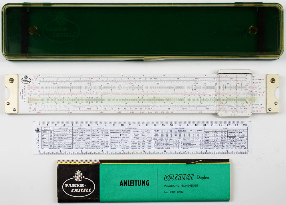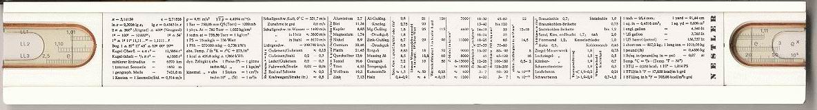 12"/10" precision Slide Rule BRAND NEW, mint condition! complete with plastic clear/green display case and 1/22 factory manual REPRINT in English! Commerce/Business rules are not very common in North America, but were widely used in Europe. It is set up to do Mark-up/Discount, simple and compound interest, currency and common unit conversions and all the normal math functions, plus log log scales on the slide reverse. Versatile wood body rule with 6 line 3-sided cursor, accessory ruler/data strip, and a 27cm ruler along the top edge. The body back has constants and formulas is German. The rule is self documenting on right hand side for all scales. A very good quality rule with black red and green scale markings. Includes scale marks for dozen (12) and gross (144). Mint condition sets, and this business style rule doesn't show up very often, especially with the unique currency scales and marks. (13 Scales + Marks, 1 Ruler) (RH) Top Edge - cm/ L Front - K, DF, [ CF, CI, C, ] D, A Bottom Edge - sh/d, Pounds Back - [ LL1, LL2, C ] Data & Formulas |
