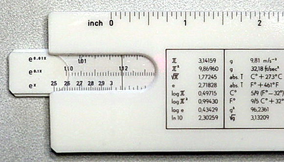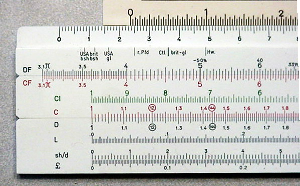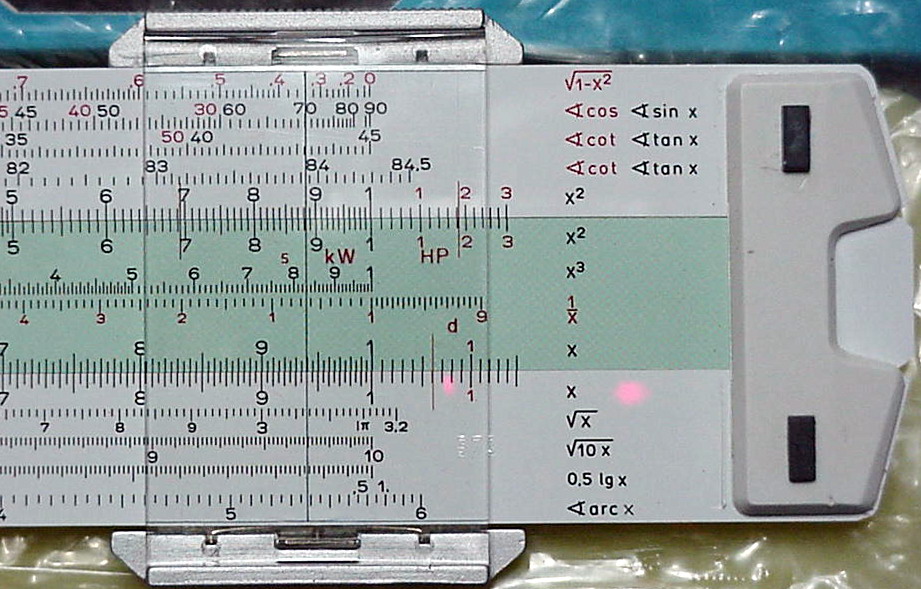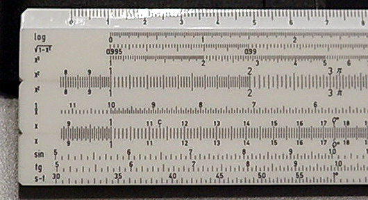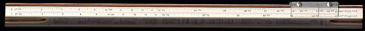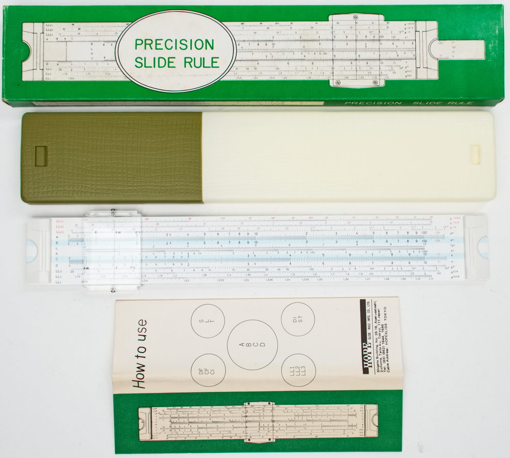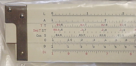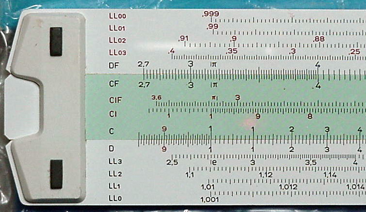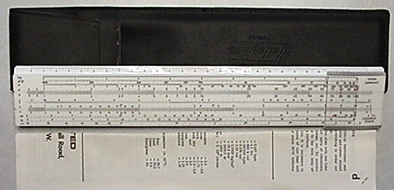 Our Best Log-Log Slide Rule Bargain!![]() FRONT, CLICK for bigger PIC! ![]() BACK, CLICK for bigger PIC! 12"/10" Precision Log-Log Slide Rule BRAND NEW, mint condition! complete with plastic white/green 2-part case and ENGLISH factory manual. MINT, perfect sets of a very advanced Log Log rule with blue accent stripes on primary scales, RED inverse scale markings, plus self-documenting on the right hand side. Has 4 trig scales (T1, T2, ST and S), PLUS P pythagorean scale, an exceptionally rich scale set and excellent user features. White plastic body and end braces with engraved and filled scales in red/black. Folded scales are at 3, with Pi also marked. Front ABCD scales also have over-range at both ends. An outstanding and attractive rule from Hope Slide Rule Manufacturing Co. in Japan. This is one of the best values on our site, just obtained from a closed South American distributor after sitting in storage for 50 years! (23 Scales + Marks, 5/2 Cursor Lines Front - LL01, LL02, LL03, A, [ B, L, K, C, ] D, LL3, LL2, LL1 Back - T2, T1, ST, DF, [ CF, CIF, CI, C, ] D, P, S |
