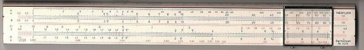 A Wonderful Classic Wood Body Design from Nestler! Finally Back in Stock! 12"/10" Darmstadt Slide Rule BRAND NEW, complete set with Nestler black and red box, 2-part blue case with gold nestler logo, and factory original English manual. Amazing mahogany body rule with 4 line cursor AND 2 edge scale sets. The engraved, laminated faces have two color (red/blue) scale markings, over-range scale extensions, P Pythagorean scale, Log Log scales on slide reverse, edge cm ruler. The rule has a top Lg edge scale (on sloped edge with the cm ruler), and the bottom edge has trig scales, S and T. Very unusual body/cursor design, see the detailed pics! An exceptionally high quality rule, in excellent condition, looks much better than the scans, as it's hard to show the wide contrast. Back has conversion factor tables. (13 Scales and 1 Ruler) Top Edge - cm ruler, Lg Front - K, A, [ B, CI, C, ] D, P Back - [ LL1, LL2, LL3 ] Bottom Edge - S, T |