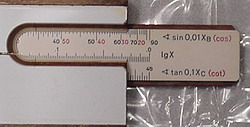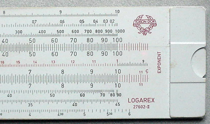 VERY LATE MODEL, made in Czechoslovakia. Powerful, brand new over-sized rule with unusually long scales and body, 6 log log scales on the body, folded (pi) scales, pythagorean and extended trig scales, and 4 line cursor. Unusually marked, this rule contains ONLY scale equivalents, no arbitrary letters. Has a soft brown padded leatherette case with top flap, and the name of the UK distributor for Logarex (Hellerman) embossed on one side. A very powerful and well-designed high end rule, but uncommon in North America. Engraved and filled red/black scales. A very high end Log Log rule with Pythagorean and extended trig scales. The 4 page Hellerman basic instructions are included. (23 Scales, 4 cursor lines)(RH) FRONT- log, sq rt(1-X2), X3, X2, [ X2, 1/X, X, ] X, sin, tg, s-t BACK- e0.01X, e0.1X, eX piX [ piX 1/piX, 1/X, X ] X, e-X, e-0.1X, e-0.01X |