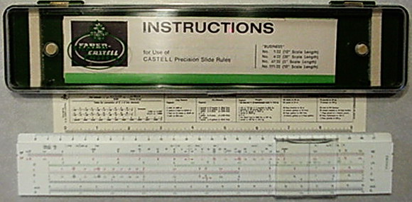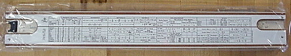 12"/10" precision Slide Rule BRAND NEW, mint condition! complete with plastic clear/green display case and factory manual in English! Commerce/Business rules are not very common in North America, but were widely used in Europe. It is set up to do Mark-up/Discount, simple and compound interest, currency and common unit conversions and all the normal math functions, plus log log scales on the slide reverse. Versatile plastic body rule with 2 line cursor, accessory ruler/data strip, and a 27cm ruler along the top edge. The body back is blank. The rule is self documenting on right hand side for all scales. A very good quality rule with black red and green scale markings. Mint condition sets, and this business style rule doesn't show up very often, especially with the unique currency scales and marks. RH (11 Scales + Marks, 1 Ruler) (RH) Front - cm/ Units, Mark-up/Discount, DF, [ CF, CI, C, ] D, L Sh/D, Pounds Back - [ LL1, LL2, C ] We also have 1 new display boxed 1/22 wood body version of this rule, complete with original manual, same price. |