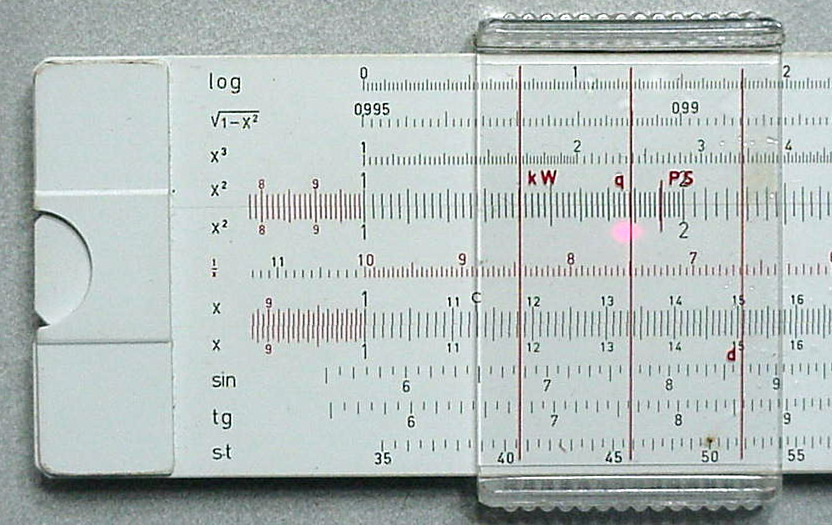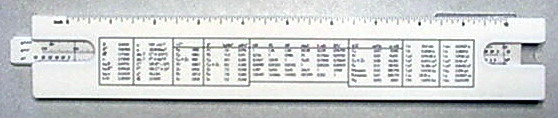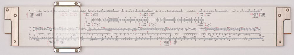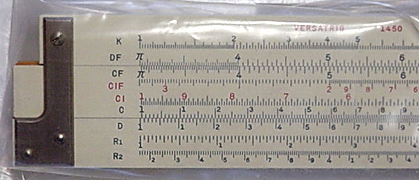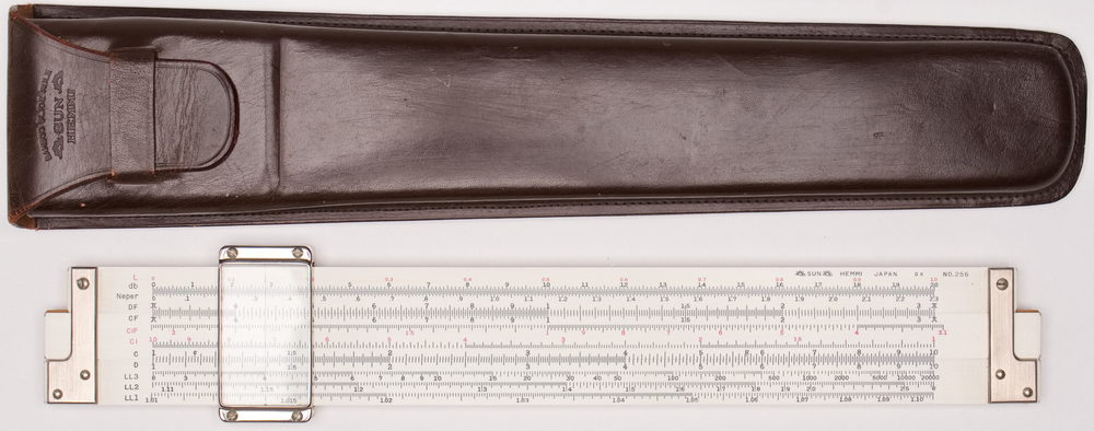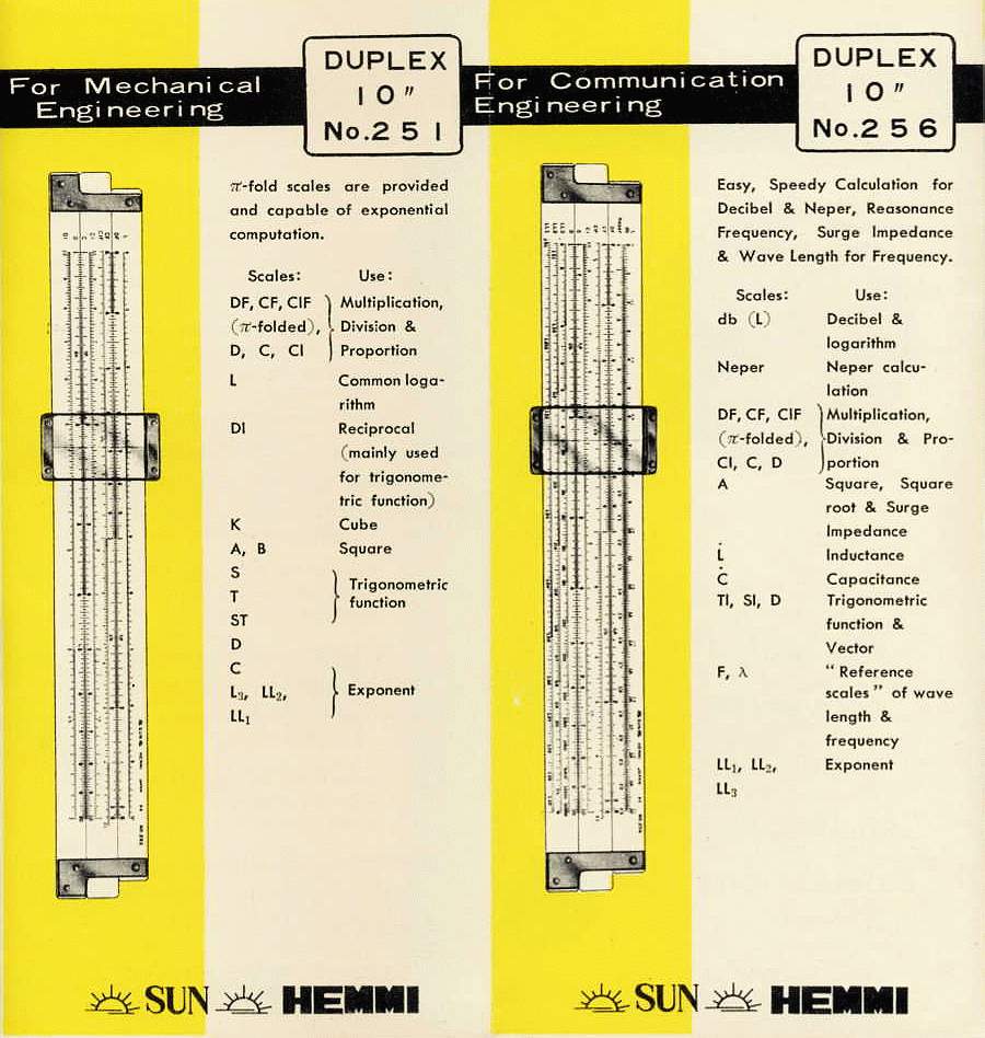 Uncommon Electronics Rule Just Arrived! 10" Sun/Hemmi Electronics and Communications Slide Rule Powerful, new full sized rule with leather case, engraved black/red scales, adjustable bamboo body, framed glass cursor. Specialized electronics scales are described in the advertisement below. An uncommon and useful rule. (19 Scales) FRONT- db, Neper, DF [ CF, CIF, CI, C, ] D, LL3, LL2, LL1 BACK- A, L, [ C, SI, TI ] D, Lambda, F Download the Hemmi operating manual HERE. The Advertising for the rule HERE. |