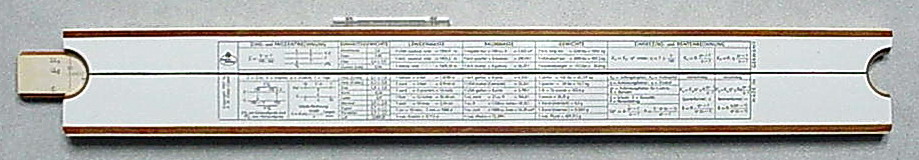 Classic FC rules, with unusual edge and in-body scales! NEW 1/98 Elektro display cased rule sets. These sets includes the rule, clear/green case, plus a reprint of the English factory manual (which also covers several related types). These sets are new and unused, and are in MINT condition (the rules are still sealed inside factory plastic bags), great examples of FC's Simplex/Mannheim rule designs. Includes the special motor/dynamo scales. 1/98 10" Elektro Rule A beautiful Electrical rule with a large 5-line front and edge cursor, two color (red/black) scale markings, and over-range scale extensions, with all scales self documenting on the right hand side. Has LL2/LL3 log log scales on the front, special electrical gauge marks, edge metric ruler (cm) a rare bottom edge K (cube) scale, and 3 slide reverse Trig scales, PLUS dynamo/volt scales inside the rule body itself. This has all the special construction features classic FC wood body rules were famous for. A very powerful and well made simplex rule with many unusual features! (RH) (13 scales, 6 cursor lines, 1 ruler) (RH) Front - cm / LL2, A, [ B, CI, C, ] D, LL3 Edge - K Inside - Dynamo, Volt Back - [ S, L, T ] |