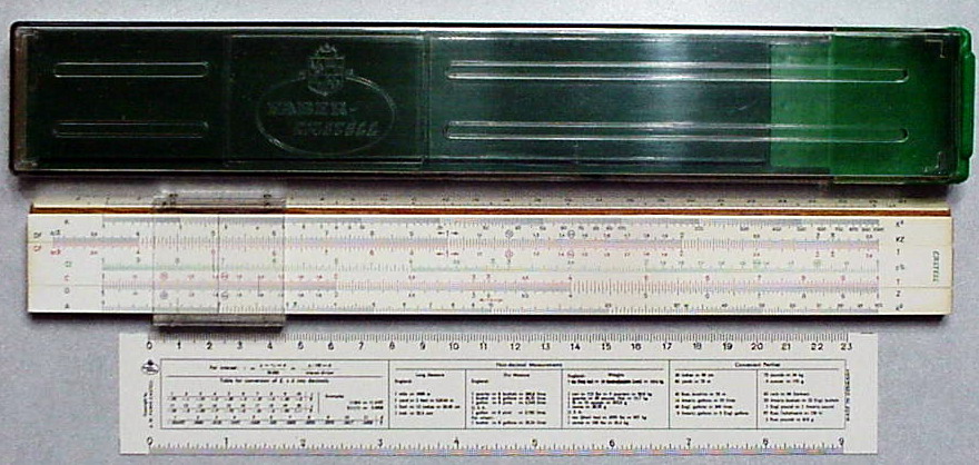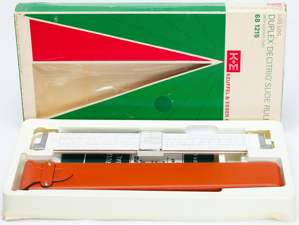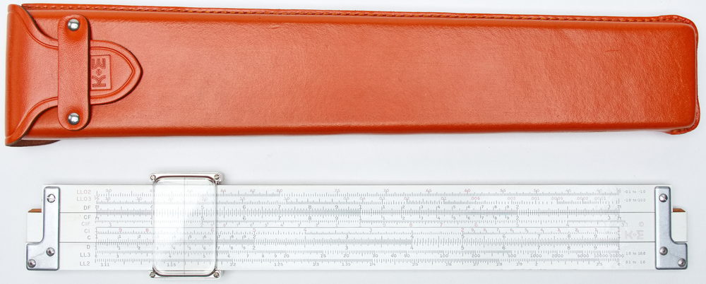 K+E 68-1215 Set with 68-1210 Duplex Decitrig Rule ![]() CLICK for bigger PIC 10" Duplex Decitrig Slide Rule is one of K+E's premiere duplex rules with engraved scales, in the final wood body format. It also has inlaid wood edges with model information and the improved unbreakable cursor. This is another confusing K+E catalog numbering issue, the 68-1215 meant the 68-1210 rule in the orange leather case, but the rule itself is unchanged at 68-1210, and is really the re-named 4081-3 Log Log Duplex Decitrig rule. Mint condition set. Great metal work, cursor and lenses, beautiful condition set for somebody looking for this high end rule. We get very few in this condition. Pic IS the actual set. (21 Scales !) Front - LL02, LL03, DF, [ CF, CIF, CI, C, ] D, LL3, LL2 Back - LL01, L, K, A [ B, T, SRT, S, ] D, DI, LL1 |