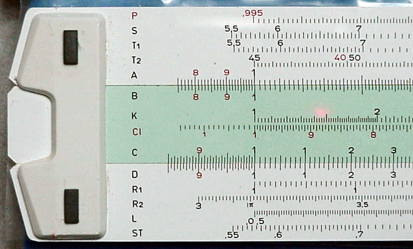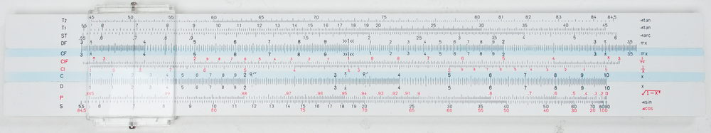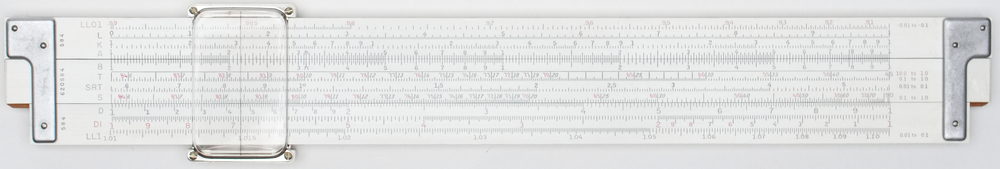 Rule is self documenting on right hand side for all scales. Has Pythagorean scale (P), BI scale, dual Tangent scales (T1/T2), folded scales and scale over-ranges. (24 scales, 8 cursor lines) Front - L, T1, T2, A, [ B, BI, CI, C, ] D, ST, S, P Back - LL03, LL02, LL01, K [ K', C, CIF, CF, ] DF, LL1, LL2, LL3 |