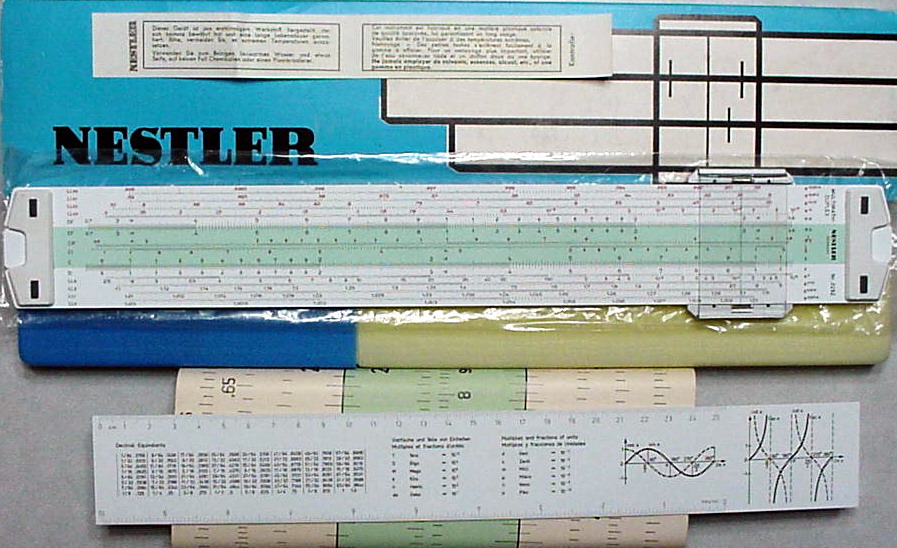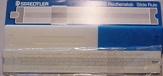 12"/10" 544 A Simplex Slide Rule BACK IN STOCK! BRAND NEW, NIB, A visually beautiful rule, complete with 2 part plastic case and factory box. The 544A features the trademark S/M blue slide and body braces, multi-line (5 line) cursor, plus two color (red/black) scale markings, and folded scales. The rule is self documenting on the right hand side for all scales. Staedtler-Mars rules are highly requested but quite uncommon in North America, and are very well made designs. Attractive blue slide and body braces, complement the bright blue and white two part plastic case. The folded scales are especially useful for mark-up/discount calculations, and a center index is well marked for this. The 'invisible brace' style with braces on the back gives the rule a very clean European look from the front. Blank on the reverse side. We have included reprints of the S/M consolidated rule instructions because these came factory packed with no instructions. These were still sealed in a factory bulk pack, so everything is in mint condition. (8 Scales, 5 Cursor Lines) (RH) Front - K, DF, [ CF, CIF, CI, C, ] D, A Back - Blank |