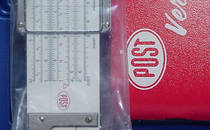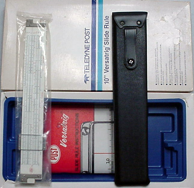 ![]() POST Contents, CLICK for bigger PIC! Transitional set, new box says Teledyne Post, but contents are still original Post. CLICK HERE to visit the POST Archive 10" NIB Versatrig Slide Rule Set Beautiful full sized duplex trig bamboo rule with framed glass cursor and embossed black fiber case (has built-in belt hanger) in factory box with english manual. The rule is still sealed in the factory plastic bag. Excellent condition set, with a bit of box wear! Please note, the box is VERY fragile and thin. Has folded CF and CIF scales, split square root (R) scales, plus DI and 3 dual trig scales. A very attractive and hard to find rule, this set is made a bit more interesting by virtue of the fact it was a TRANSITIONAL set, boxed as Teledyne, but with all the contents marked as POST. As with all bamboo body rules from Post or Teledyne Post, they are actually made by Hemmi in Japan. (17 Scales) Front inch - K, DF, [ CF, CIF, CI, C, ] D, R1, R2 Reverse - L, A, [ T, SecT/ST, Cos/S, C, ] D, DI |