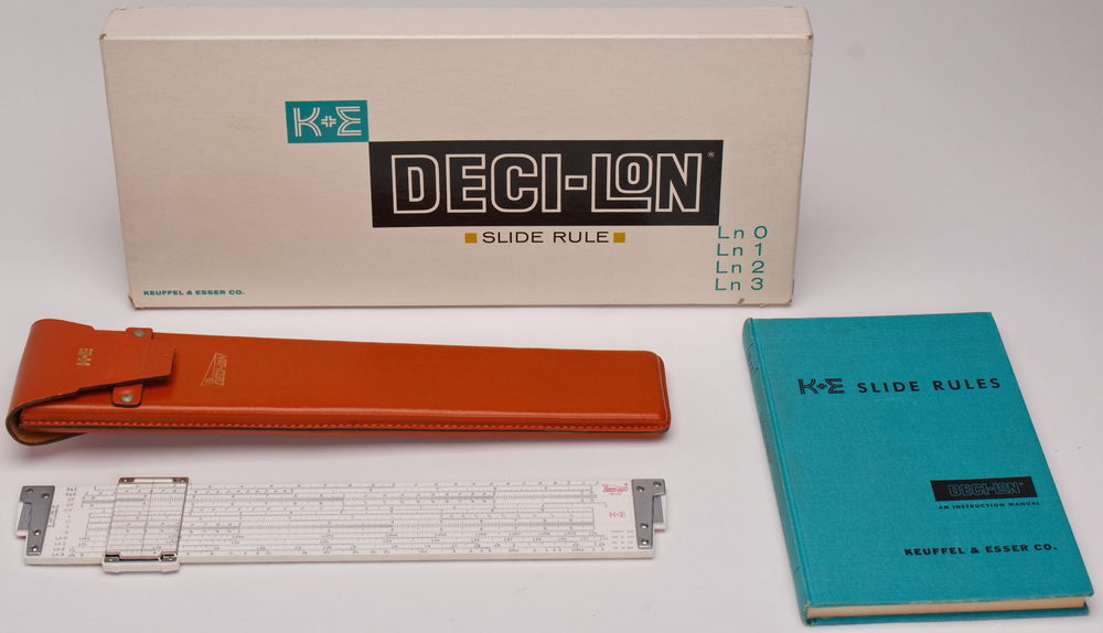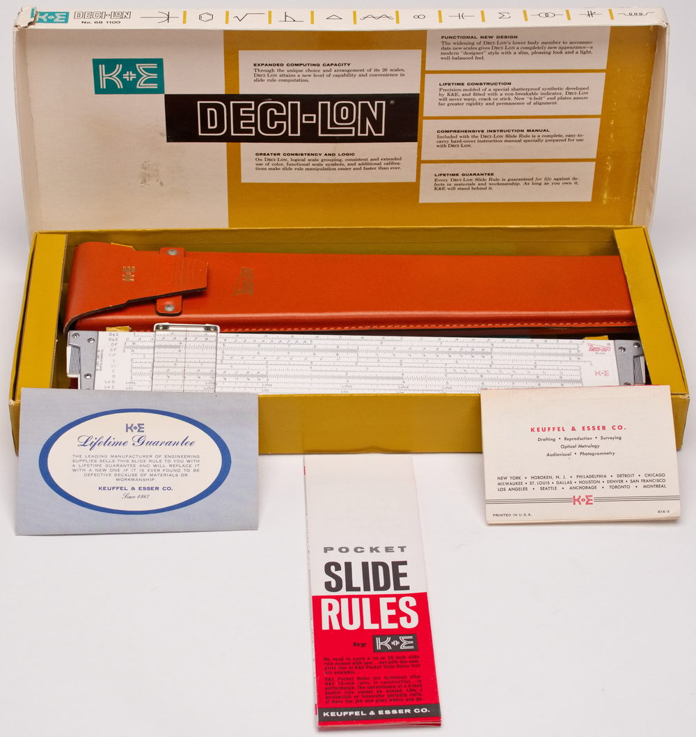 ![]() CLICK for bigger PIC! ![]() CLICK for bigger PIC! Boxed Set 12"/10" Deci-lon Slide Rule Ivorite, Log Log Duplex Decitrig rule, metal framed unbreakable cursor. White "Ivorite" construction, with engraved black and red scales that include directional tilt for inverse trig scales. Complete with original K&E gold embossed orange leather case, display box, belt loop, hardbound book and care booklet. The Deci-lon has extra dual square/root scales, and range data for log and trig scales on the face. The actual set is pictured, excellent condition, one of the best we have ever had. (26 Scales !!) Front - Sq1, Sq2, DF, [ CF, CIF, L, CI, C, ] D, Ln0, Ln1, Ln2, Ln3 Back - Ln-3, Ln-2, Ln-1, Ln-0, A, [ B, T, SRT, S, C,] D, DI, K |