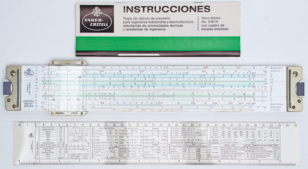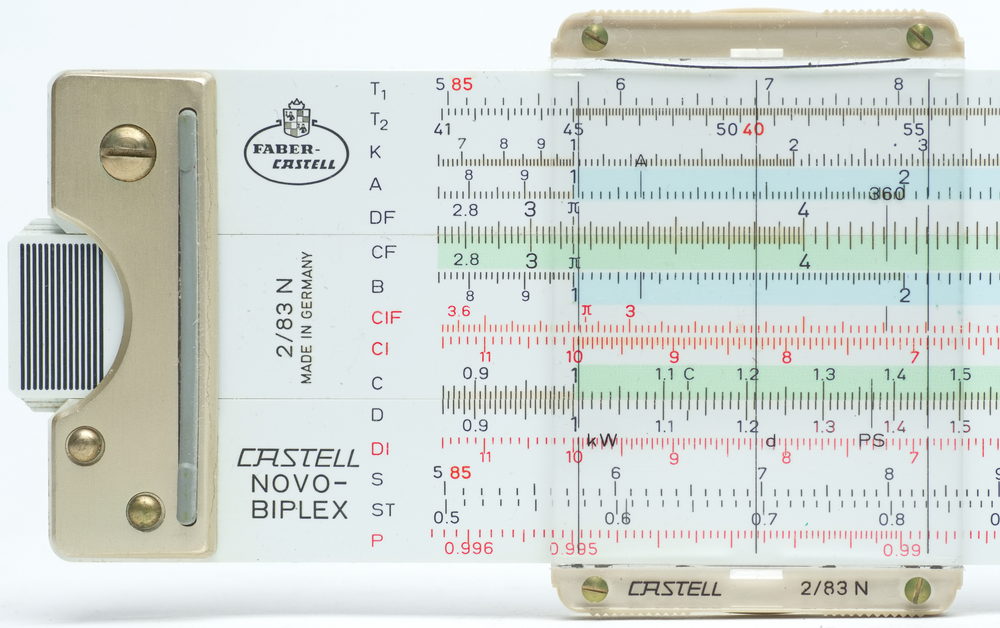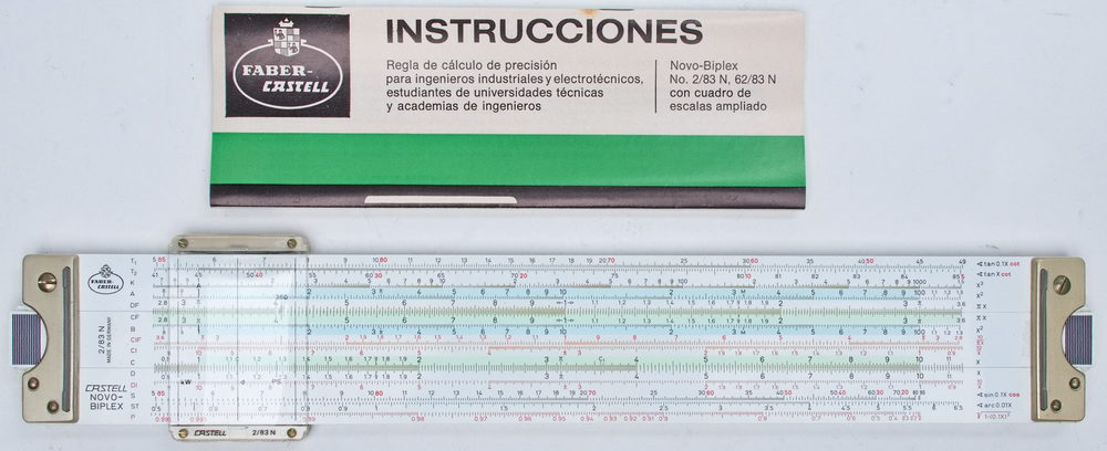![]() Click for bigger PIC! ![]() Click for bigger PIC! BRAND NEW, MINT condition boxed 2/83N Novo-Biplex factory leather cased rule sets with factory Spanish manuals and accessory rulers. These sets include the rule, Green OR Brown case, accessory ruler and Spanish (factory) and English (reprint) language manuals. These sets have been in storage in South America for 50 years and look virtually untouched (better than the pics can easily show), with brilliant metalwork and end braces. You will be very pleased with these, they are top condition by any standard, and we have opened and inspected every set. All the cardboard boxes show some light foxing and spots from 50 years of storage, but the sets inside are wonderful. I really like this rule, and these sets are exceptional, a wonderful gift for you or that rule fanatic you know, or for your kids as a real keepsake treasure. The case has a front FC logo, and stores the manual, and accessory ruler inside, but our investigation shows that the ruler can out-gas and affect the slide rule scales (bleeding), so it is better if not packed inside. This rule is variously marked Novo-Biplex (mainly for sale outside Germany), and Novo-Duplex in Germany, these sets all say Novo-Biplex. Everything has been inspected, cleaned and polished, for the best possible appearance. We paid a very high price to get and air-ship these sets, so they are expensive, but you will not find them in better condition anywhere. One of the nicest plastic body rules ever made, with gold anodized adjustable aluminum end braces, duplex 5/4-line cursor, two color (red/black) scale markings, and trademark mint green stripe on primary scales (both sides), plus additional blue stripes on the A and B scales, and massive 2 1/4" wide body. This rule also has expanded W square root scales, for both the square root of x and 10x, 8 log log scales, and raised rubber bumpers to prevent cursor scraping, and to give the rule grip on a desktop. The rule also has finger-grip areas on the slide for better movement. Body is fully alignable at the aluminum end-pieces. The cursor pops off (note the recess on the side bars) for easy cleaning, while retaining its alignment, a very handy feature! Rule is self documenting on right hand side for all scales. Has Pythagorean scale (P), expanded square scales, folded scales and scale over-ranges. These late sets were from a distributor's warehouse in South America. (30 scales, 11 cursor lines) Front - T1, T2, K, A, DF, [ CF, B, CIF, CI, C, ] D, DI, S, ST, P Back - LL03, LL02, LL01, LL00, W2 [ W2', CI, L, C, W1', ] W1, LL0, LL1, LL2, LL3 |