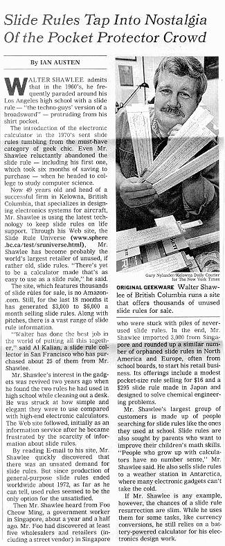 | February 18, 2003 | Nice article about us and the slide rule community in the Wall Street Journal, first page, no less. CLICK to see! (link by permission of the WSJ) |
