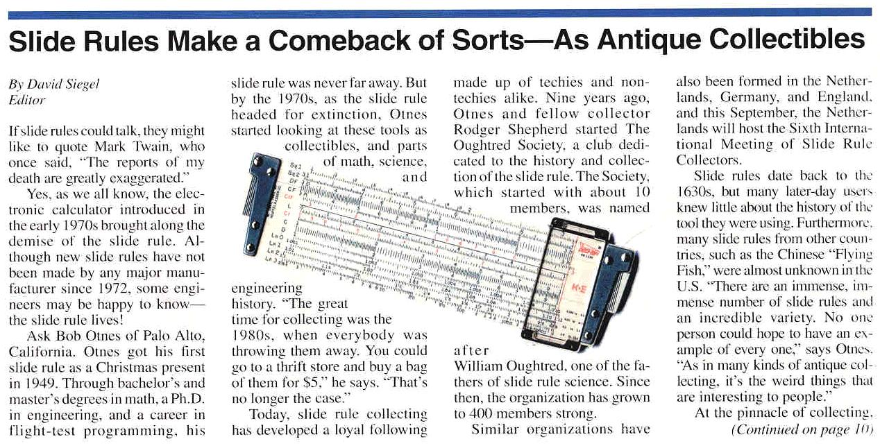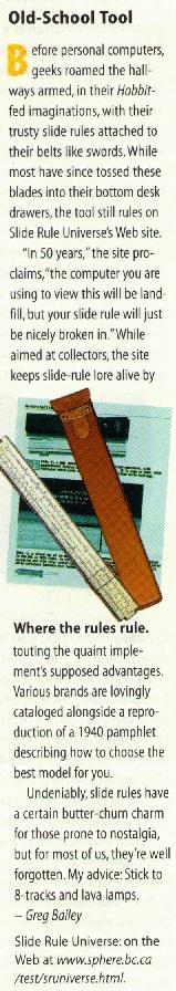 ![]() The Slide Rule Universe The Retailer of the Lost Electronics Ark ![]() Nice article about us in the 2007 November IEEE Spectrum on-line, CLLICK to see! Selected as a Learning Kingdom's Cool Site of the Day, October 9, 1998 The SRU is featured in the November 1998 issue of ![]() See the May, 2000 article about slide rules, collecting and us.Here are the locally stored pages scanned from the issue, PAGE 1, PAGE 2. |