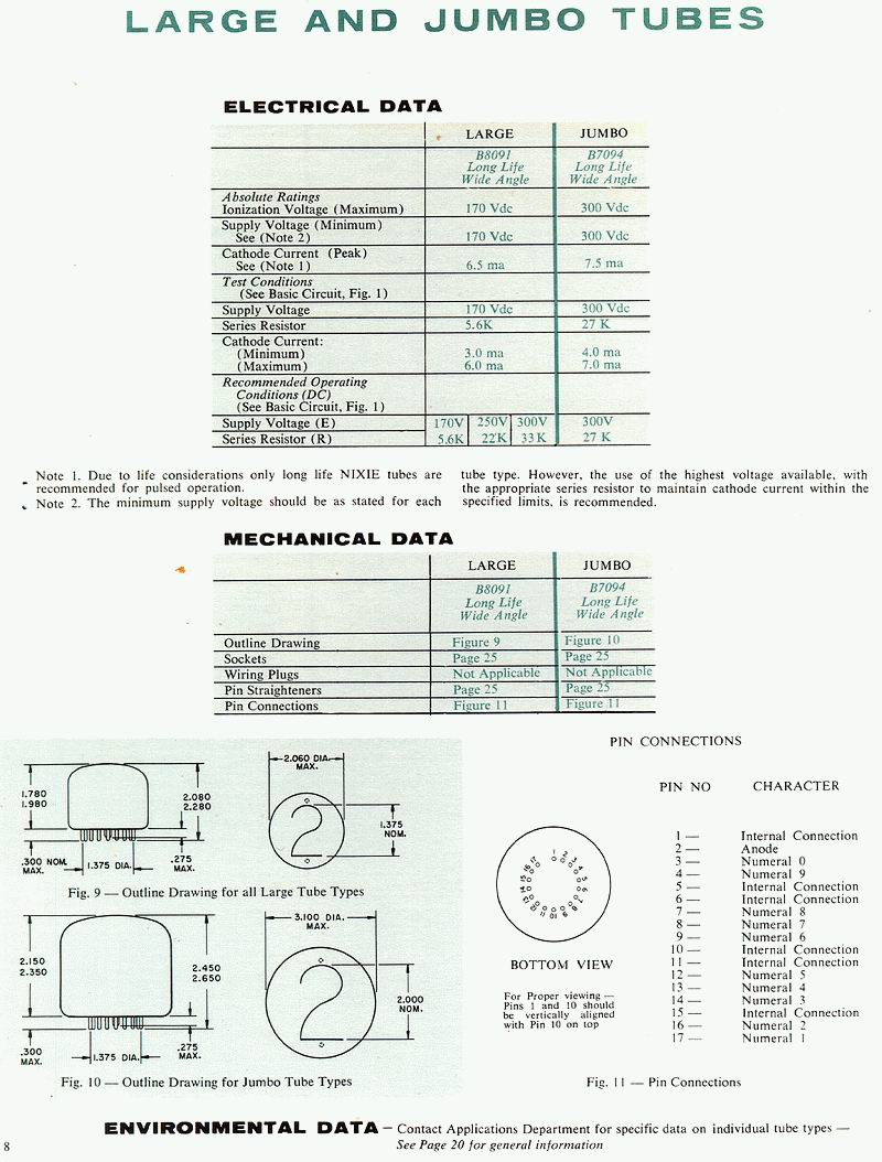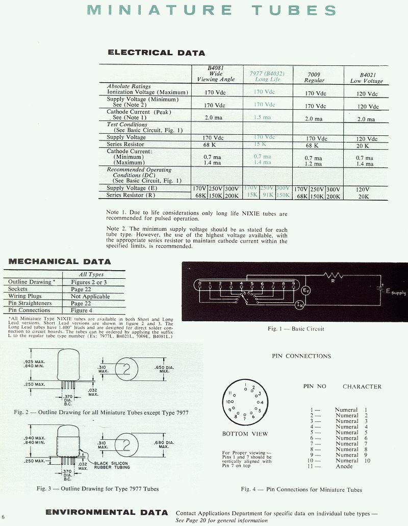 Data Sheet covers these nixie tube numbers: B5031 B5092 B6033 B6091 6844A 7153 8037 Click on the drawing at left to bring up the full sized data sheet, includes tube specs, pinout and mechanical drawings. |