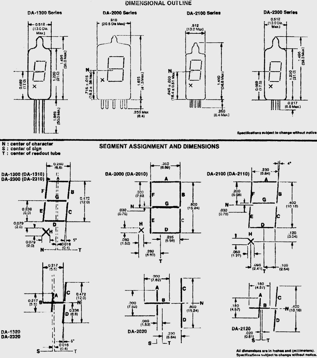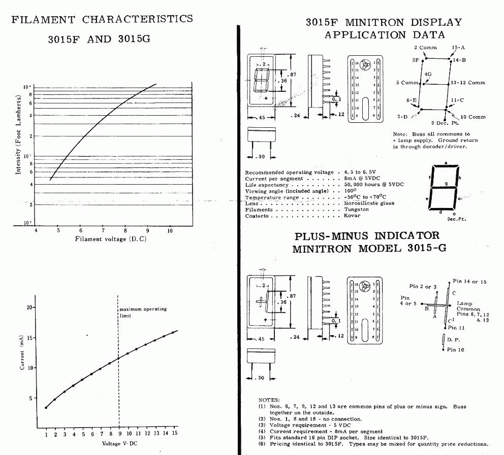 ![]() Data, CLICK for bigger PIC! MINITRON Vertical view, miniature size, filament type 7-segment tube, fully solderable, or fits in standard IC socket. Can be driven from conventional 7447 LED drivers, will display any color with filtering, great for clocks, no HV required, run from 3-9VDC, 5VDC optimum. |