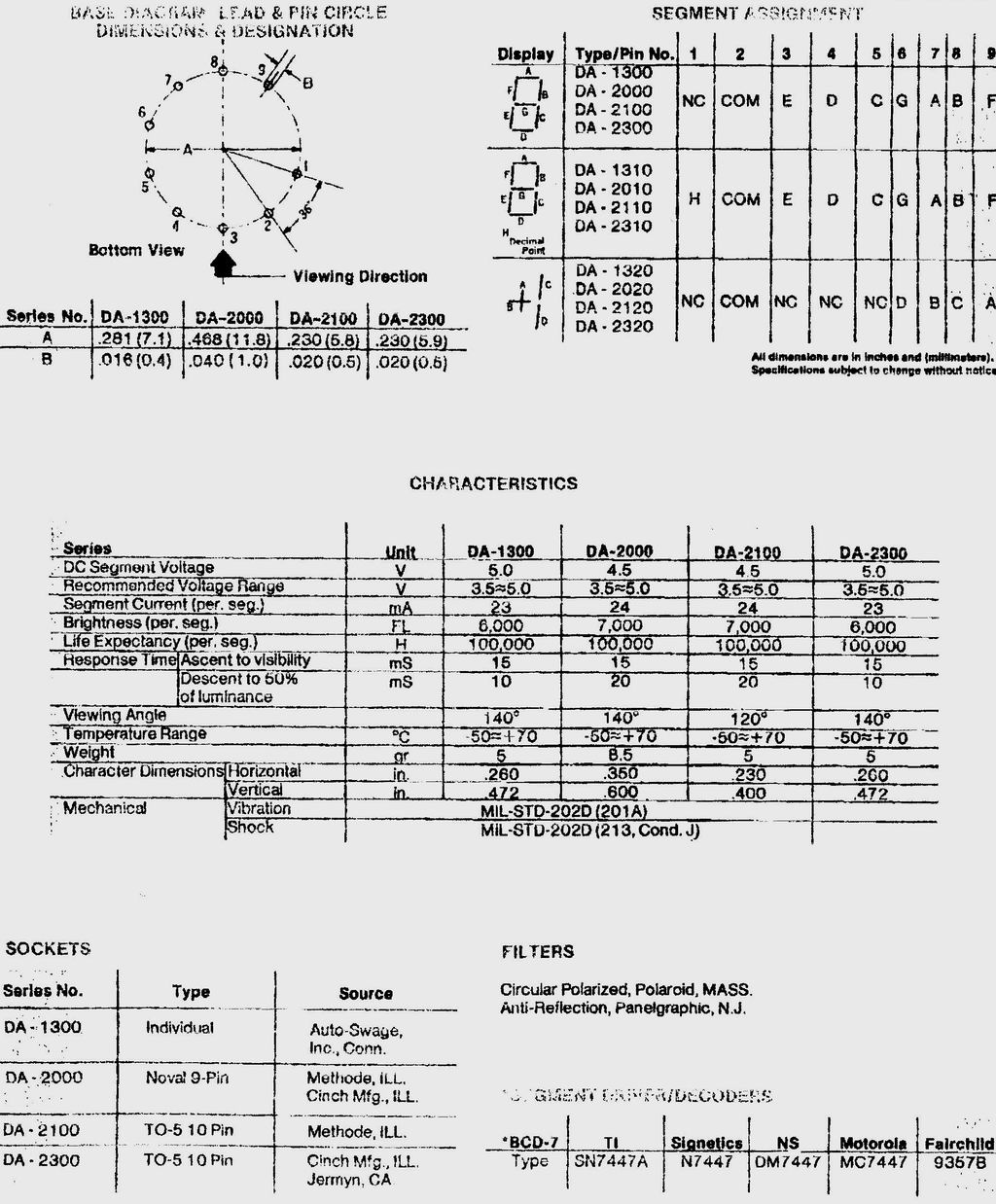 | 1970-0002 | 10 Digit, end view. Characters 0-9, Ionization at 170VDC, Anode current 2.2mA average. Diameter 1.040in. Seated height 1.060in. Known equivalents: Burroughs B5092, National Labs NL-5092. |