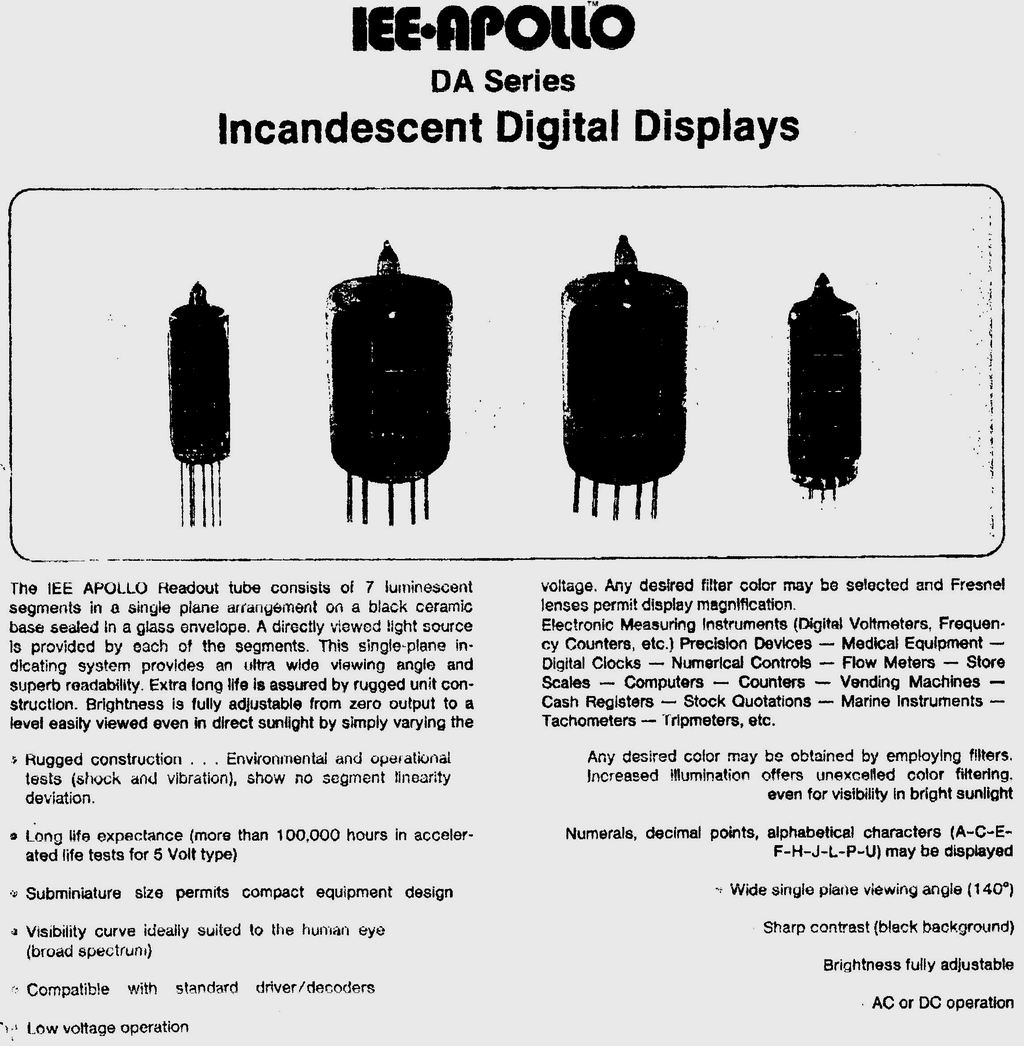 | 1970-0071 | TUBE-ELECTRON IND-NUMERIC; 16 DIGIT; .250 IN CHAR. Known equivalents: Vishay Intertechnology Inc. 2215804, Burroughs BR16252. |