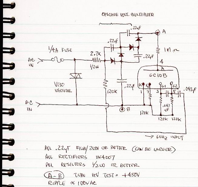 Building Your Own Dekatron Spinner (115VAC/60Hz) ![]() CLICK for Bigger PIC! The incoming AC line voltage (115VAC) is rectifed and multiplied by the cascade multiplier. Under load, this produces +450VDC with about 100V of AC ripple, which is used to power the tube. Ripple can be reduced by increasing the capacitor size from 0.22uF, but the risk of shock goes up proportionally. This circuit stores very little energy, but can still be quite dangerous. CAUTION! The 0.22uF capacitors REMAIN CHARGED even with AC power removed, and must be carefully discharged if you will be working on the circuit! All capacitors should be rated at 250VDC or better, plastic film or similar types. The spinner takes the incoming 60Hz line frequency, and feeds it into the Dekatron counting input, so that it whirls around 6 times a second (divides by 10). Very visually entertaining, BUT be CAREFUL, 450VDC is present, and is potentially fatal if touched. The Varistor is shown to prevent line transients from damaging the circuit, you may want to add a power switch, etc. Ground NO PART of this circuit, and be sure everything is well insulated from any possible human contact. A pic of the Prototype is to the left. |