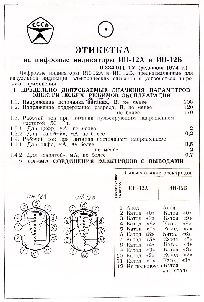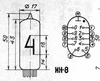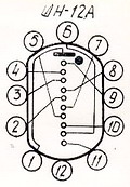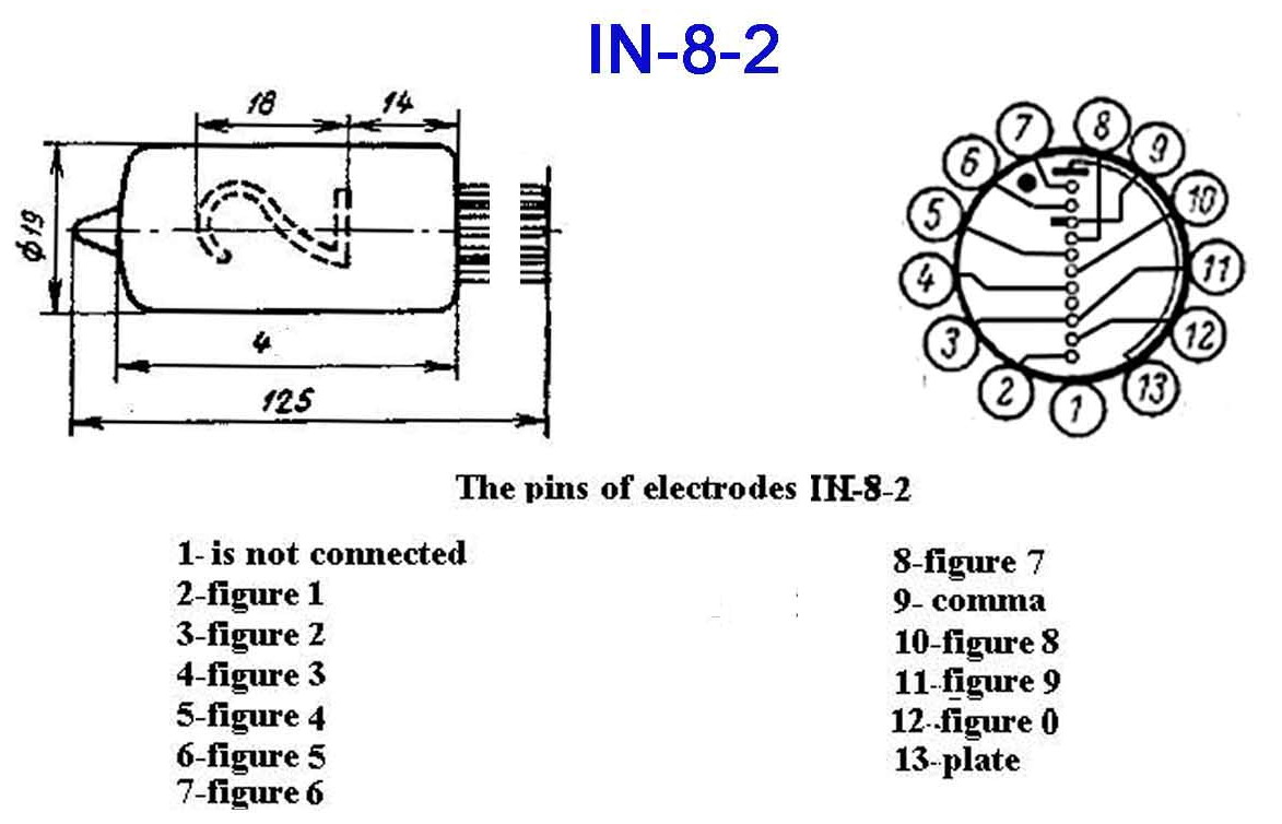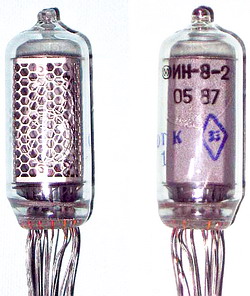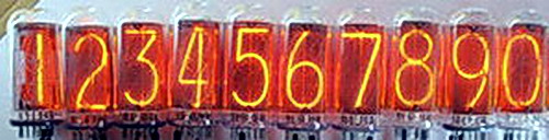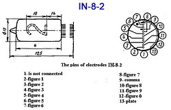 ![]() Standard side view tubes, 11-pin plug in base (same socket as IN-2 tubes). These are classic tubes from old soviet union military production, all new old stock. These test very well, great looking true-form digits (different 2 and 5), and are very bright. The lit images are at +170VDC (optimum 170-180VDC), and a 33K series resistor, its rated current is optimally 2.5-3.0mA per digit.