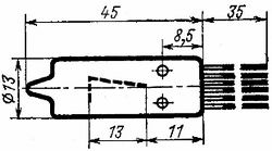 ![]() Standard side view tubes, with long flying leads. These are classic tubes from old soviet union military production, all new old stock. These test very well, great looking true-form digits (different 2 and 5), have a decimal point, and are very bright. The lit images are at +170VDC (optimum 170-180VDC), and a 33K series resistor, its rated current is optimally 2.5-3.0mA for digits, 0.3-0.4mA for the decimal point. The digit height is 18mm, the overall width is 19mm. The dimensional diagram is in millimeters. Great for Nixie clocks, easy to wire, no sockets required. The Anode (pin 1) is easy to identify, it has insulation inside, and is at back of the tube when the digits are facing you. Getting very hard to find! | $16 Ea. |