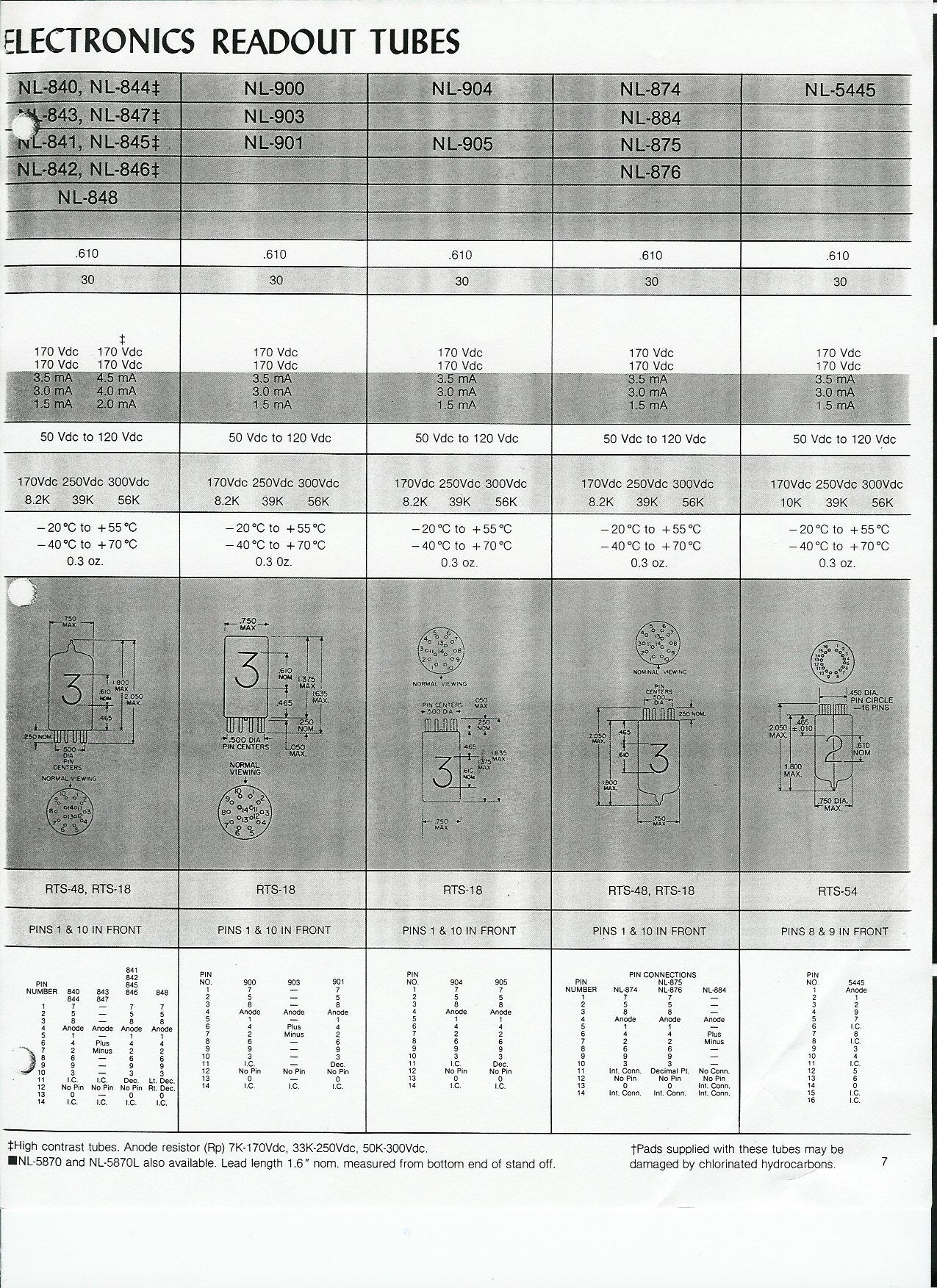 ![]() TUBES! National Top view, micro-miniature NIXIE tubes. New, MIL-spec boxed tubes every tube has been 100% electrically tested. These have a surrounding black sleeve to prevent light leakage when closely spaced, and are the smallest known nixie tube made, with excellent characters. Very popular for Nixie Wristwatches! Here are compatible miniature pinouts (7009) ![]()
