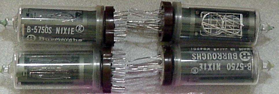 Vertical view, medium digit (0.55 inch characters) NIXIE tubes, with spacers and short leads that can be soldered directly to a PCB or plugged in, includes bottom spacer/insulator, 14 pins, both LH/RHDP. Extremely attractive, ideal for experimenters thanks to solder attachment. Excellent condition tubes pulled from low time display assemblies, and are fully tested and known good. These are designed for multiplexing, but are otherwise identical to similar based/shaped tubes (B-5750, etc.), and work in either direct or multiplex applications. | $15 Ea. |