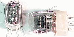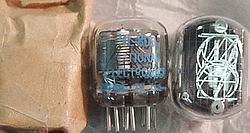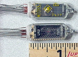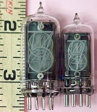 ![]() Side view, large digit NIXIE tubes, miniature 16 pin pluggable base type, RH/LH DP. New, factory boxed tubes. | $20 Ea. |