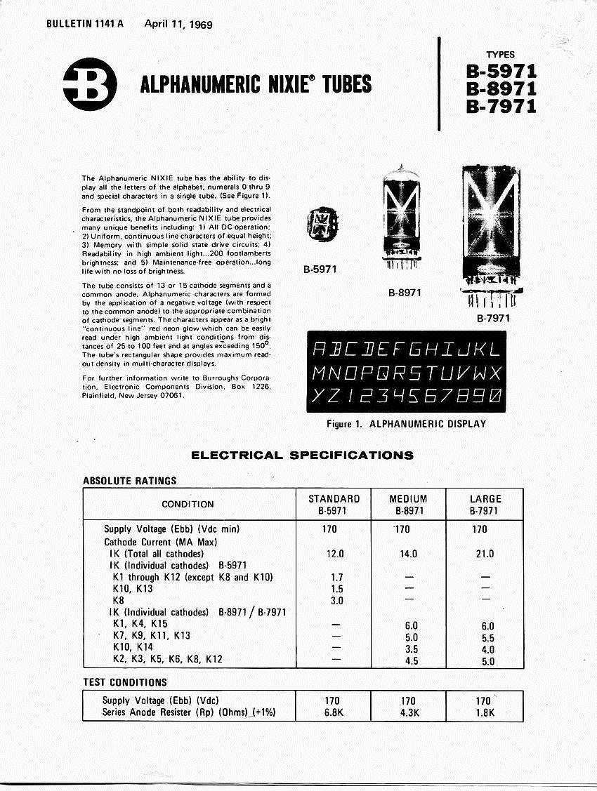 ![]() NIXIE B-5971 B-7971 B-8971 Alphanumeric Nixie Tube Reference Data |