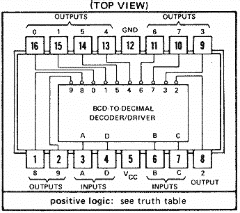 ![]() K155ID1 Nixie Driver 74141 Equivalent Pinout (also generally replaces 7441/A parts, but additionally supports blanking) |