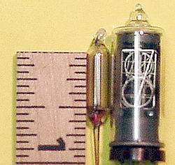 Large A1A Neon Lamps! 0.5" extended Neon Lamp, ideal for leading 1 digit, for clocks, over-range indications, etc. Excellent match to most Nizie digits in size and appearance, good drive via a 68K or higher resistor from +170VDC. Note, only one electrode lights with DC drive, be sure to face it forward, both light with AC drive. |