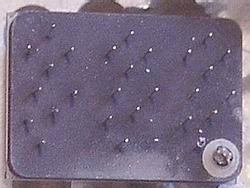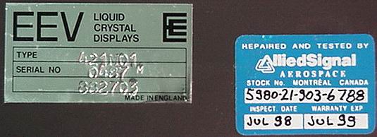 EEV LCD Avionics Display Fascinating display sub-assemblies, with 4 Alpha characters, and 4 Numeric (with polarity) characters in 2 display windows. These high contrast large character displays have heaters for low temp operation, and backlighting, which appears to be an EL panel, although marked +/- on the board; it goes directly to the mating connector. CLICK HERE to see one of the 3 display controller chips. We have tried to get data on this assembly, but no luck, so these are for the braver experimenter out there. The mating connector is non-standard, but a 0.1 inch pitch header will plug into it. Beautifully made precision assembly, all are newly overhauled spares. | $29 Ea. |