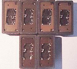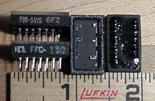These have a 13 pin ceramic/epoxy DIP package, 0.472 inch digit, with a flat glass lens. Every one has been individually tested, and is guaranteed good! We rarely see these, and new ones are almost unheard of. These are rated for 100,000 hours at 5VDC, with 4500fL brightness (15mA/segment). We get endless inquiries for this style displays but rarely see any now. We have 12 dual marked FDB-5V15 and FFD-11C, and 6 marked only FFD-11C. All work the same, the dual marked parts have a speckled seal around the front display glass, the single marked parts have a smooth dark gray seal. NO, these are NOT pin compatible with the 3015F, but are roughly the same size externally. ![]() | ||||