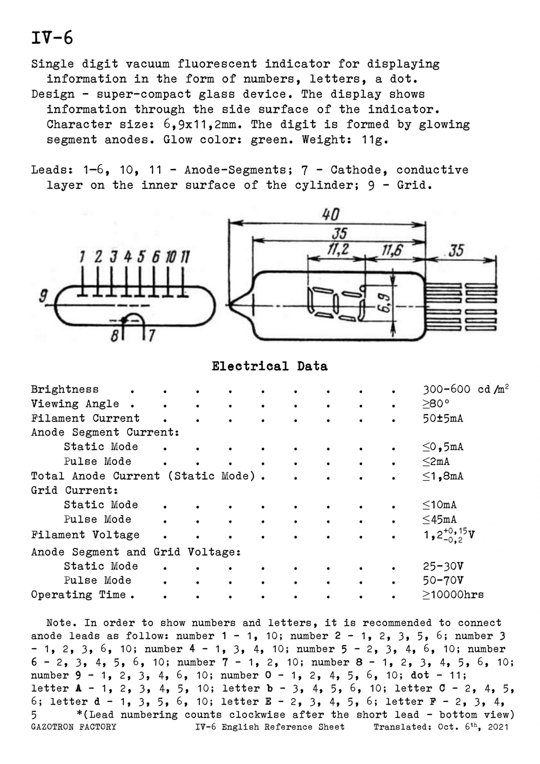Sovtek IV-6 7-Segment VFD Displays CLICK HERE for PDF of Full Russian Data sheet with pin out and base diagram.
