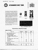 Character size: 12.4 X 18mm Filament voltage: 1.0 to 1.32V Filament current: 85 to 115mA Grid Voltage: Constant, 23 to 30V, Pulse: 80V Voltage at anodes, 7-segments: Constant 22 to 30V, Pulse: 80V Grid Current: 6 to 12mA Current at anodes, 7-segments total, constant: 2.5 to 6mA Lifespan: 10K Hours Pin connections: 1,2,3,4,7,8,10,11 Anodes - segments 5, 12 filament 6 grid 9 free | Tubes $5 Ea. Tubes and Sockets, $9 Ea. |