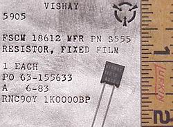 CLICK to visit VISHAY! 1K Precision Resistor 0.1% VISHAY, bulk metal foil precision resistor, very temperature stable, 10K, 0.1% tolerance, 0.6W. Very useful for quick tests in the lab, can be measured to high accuracy, will hold the value over time. 5ppm/degree C temperature stability, -55C to +125C operating range. Still sealed in mil packaging. New old stock. |