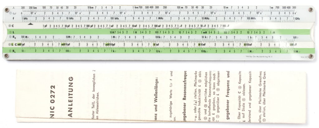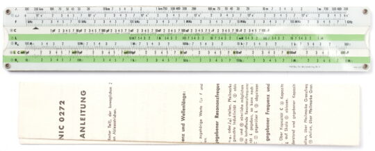 A double sided slide chart used for frequency calculations. Includes original instruction sheet in German.