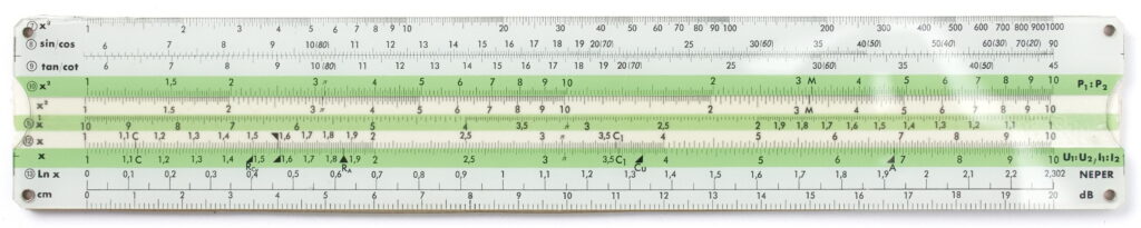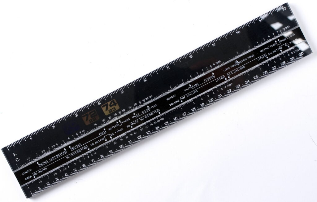 This is a very thorough and intuitive conversion set created by Pickett which uses interchangeable discs secured by a thumb screw to modify the rule for different unit conversions. The rule also features C & D scales for multiplication and division.
