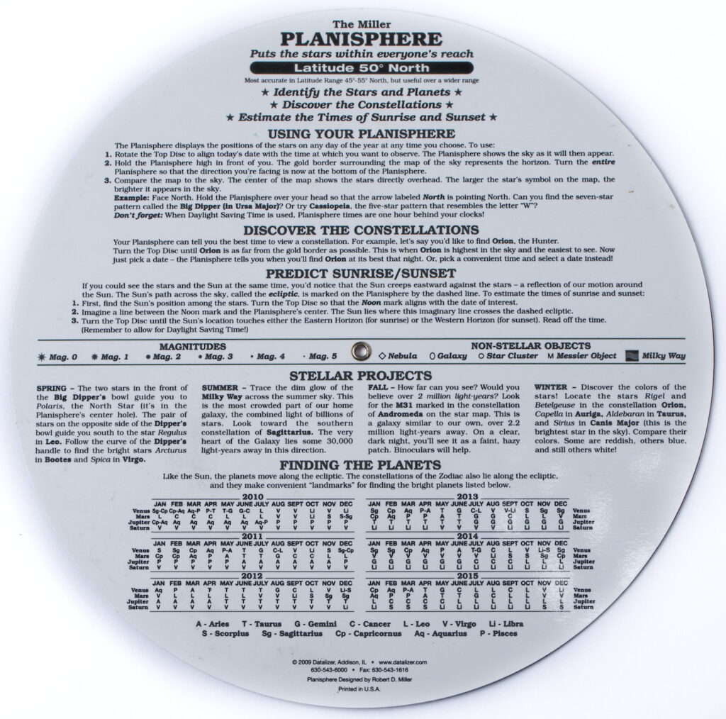 Clear and easy to use, this star finder has two concentric rings on one side for lining up the chart to your surroundings, and easy to understand directions on the reverse side.