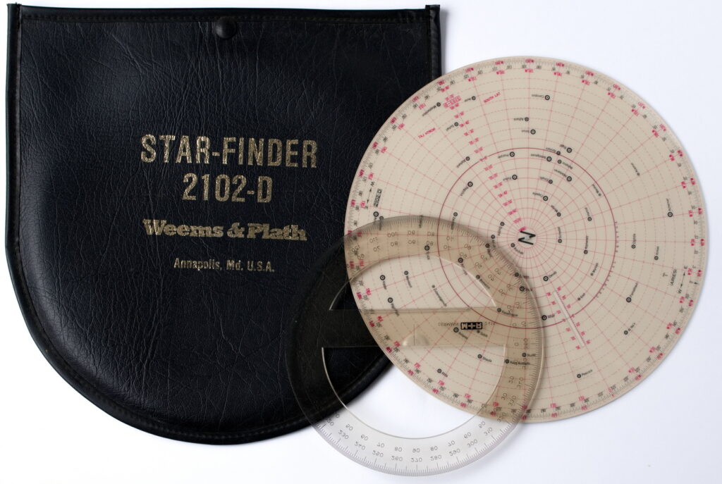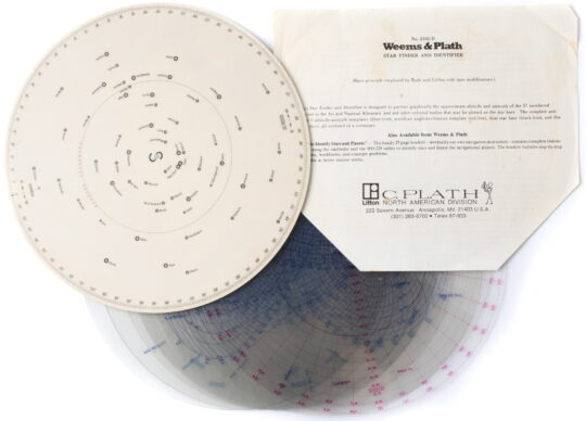 Includes manual, 10 latitude overlays, double-sided circular map/chart, and protractor.