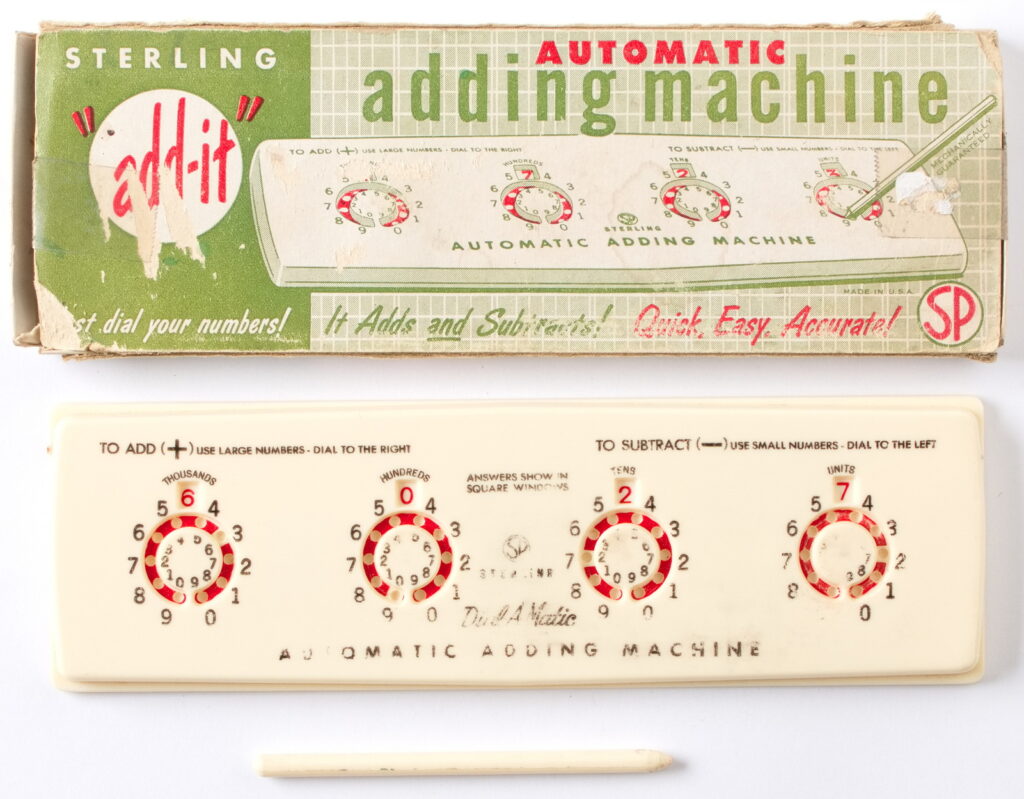 The Sterling “Add-It” machine uses an included stylus to allow a user to add and subtract. Usage directions printed on the front of the device.