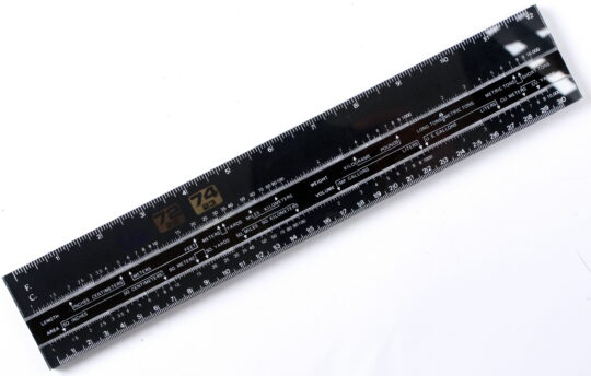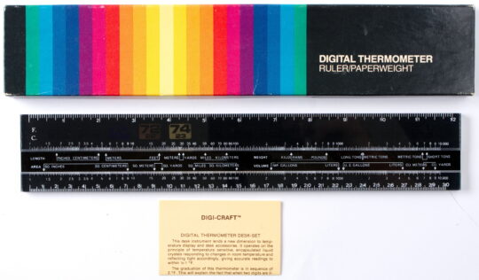 This ruler uses temperature responsive liquid crystals to read-out room temperature in C/F. It also features metric and imperial measures on the upper and lower edges, and a slide in the center for completing metric/imperial conversions for mass, volume, and distance.