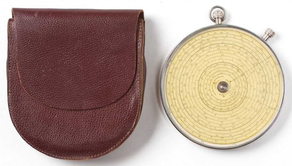 Made of ‘Aristopal’, comes complete with zippered leather pouch. This rule is in excellent condition, and the case is in fair condition (some scuffs/marking). The similar 617 has an additional rotating wind arrow on the back face, not present on these models. Comes with an English manual reprint, and original German manual.